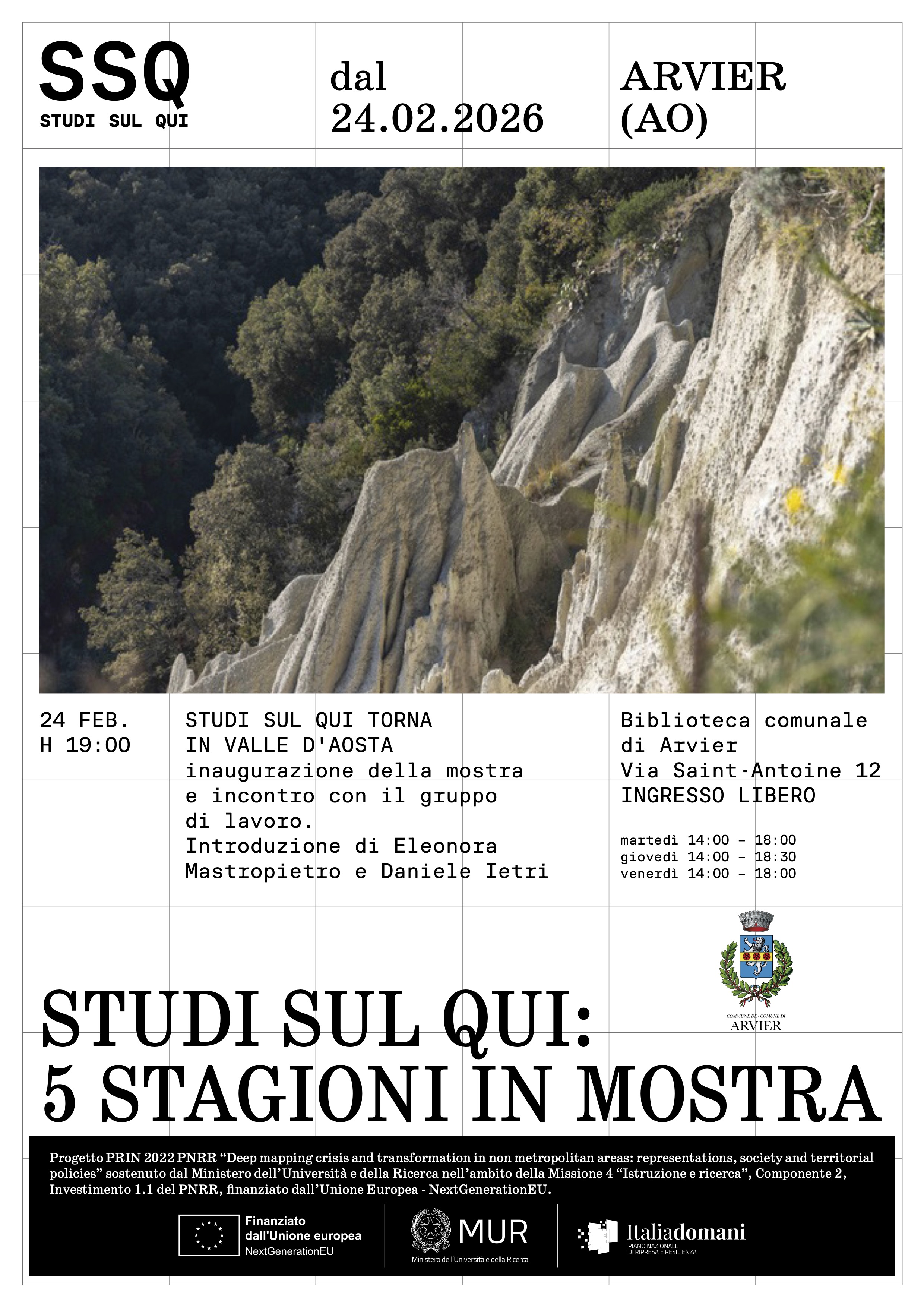 Da martedì 24 febbraio la Biblioteca comunale di Arvier ospita un’installazione che racconta cinque stagioni di lavoro di campo di Studi sul Qui attraverso immagini, suggestioni visive e materiali multimediali.